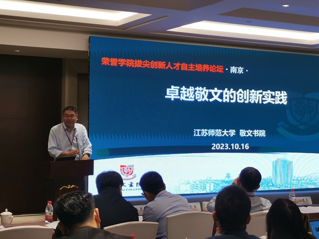 2023年10月16日,“荣誉学院拔尖创新人才自主培养论坛”在南京理工大学钱学森学院成功举办,来自全国24所高校荣誉学院从事拔尖创新人才培养教育教学改革的70余名同仁参加本次活动。敬文书院应邀参会并做了《卓越敬文的创新实践》大会主题发言。在“2023荣誉学院拔尖创新人才自主培养论坛”大会主旨报告会环节,北京理工大学徐特立学院、北京航空航天大学沈元学院、上海交通大学致远学院、西北工业大学教育实验学院、电子科技大学英才实验学院、中国地质大学(武汉)李四光学院、东南大学吴健雄学院、南京理工大学钱学森学院、中国矿业大学孙越崎学院、江苏师范大学敬文书院等10所荣誉学院的主要负责人分享了各自高校在拔尖创新人才培养中的先进经验和改革智慧。我校敬文书院是大会10所主题报告学校中唯一一所非教育部基础学科拔尖学生培养计划2.0基地建设学校的荣誉学院,敬文书院十二年来的探索和创新发展所积累的经验和取得的成果受到与会者的高度关注。会议期间,书院与各参会荣誉学院进行了广泛接触,就拔尖创新人才培养方案制定与实施、培养质量评价与分析、学生创新能力培养、全国荣誉学院优质资源共享等核心问题进行了深入探讨和交流,收获的新思路、新可资借鉴的经验,这都将助力书院卓越人才培养工作。